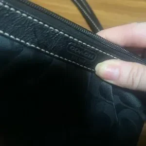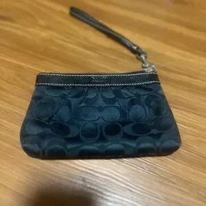 Coach wristlet with signature jacquard pattern. Top leather trim and wrist strap. Silver hardware and zipper closure. Compact and stylish for essentials.