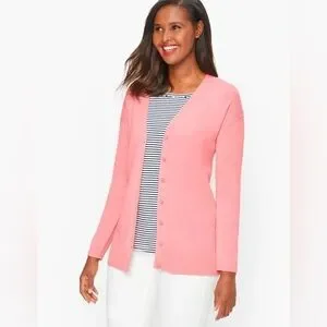 Brand new with tags - Women’s Talbots Button Front Girlfriend Cardigan Long Sleeve V-Neck Sweater. Has buttons down the front (extra button on label), v-neck, and slits on the bottom sides. Color: gardenia pink. Size: XS.