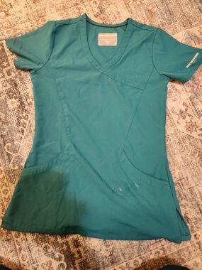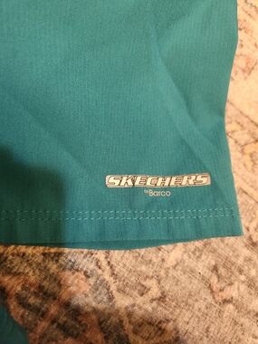 Skechers scrub top in a vibrant teal color. V-neck silhouette with front pockets. Lightweight fabric for comfortable wear. Simple, professional look. 2 pockets. Very stretchy. Shiny spots near bottom as seen in pictures.