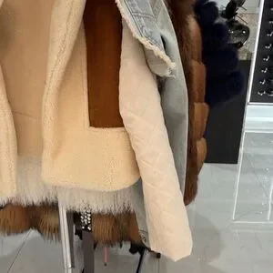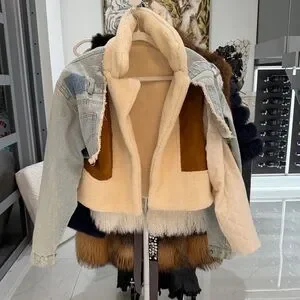 Cream Sherpa-Lined Denim Jacket with Brown Suede Accents