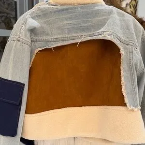 Lightwash denim jacket with cream sherpa lining and brown suede pocket panels. Features a cozy sherpa collar and warm insulated interior. Stylish and versatile for casual layering. Includes cream color details and brown suede accents. NEVER BEEN WORN