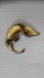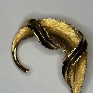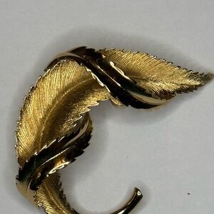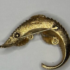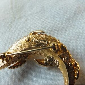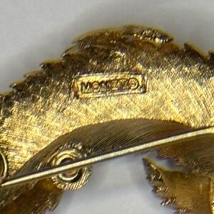 This is a vintage gold-toned brooch pin with a textured, swirled leaf design, signed by Monet.