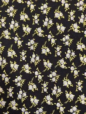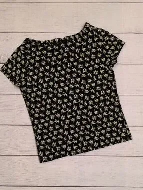 Black scoop-neck crop top with a small floral print. Short sleeves and a fitted silhouette. Lightweight and easy to style with jeans or skirts.