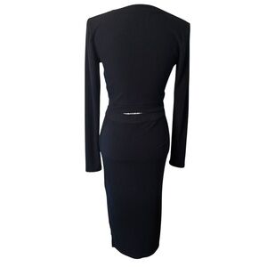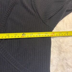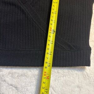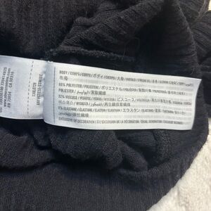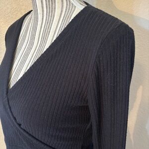 Both pieces are Black in a Soft and Comfy Ribbed fabric (Poly/ Viscose Blend with 8% Elastane for great Stretch). The Top is Cropped, and has a Faux Wrap design with Long Sleeves.