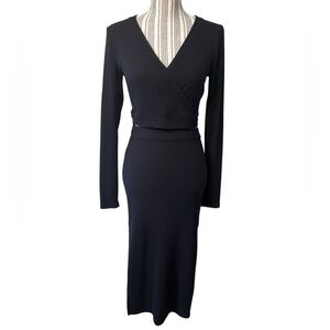 Matching ribbed knit set with a wrap-style crop top and coordinating maxi skirt. Sleek silhouette and stretch fabric for a fitted look. Neutral black tone for easy styling. Modern, minimalist ensemble suitable for day or night.