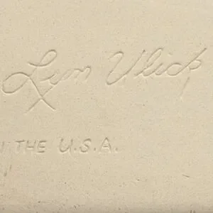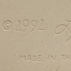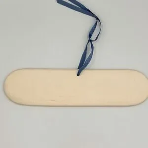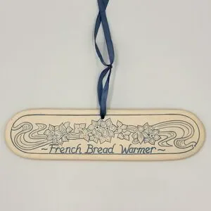 Vintage 1991 Lyn Ulick French bread warmer in cream ceramic with blue floral and scroll design. Signed on back and marked Made in the U.S.A. Decorative and functional piece for farmhouse, cottagecore, and French country kitchens. Long oval shape with hanging hole and ribbon, great as kitchen wall decor, bread warmer display, or collectible studio pottery accent.