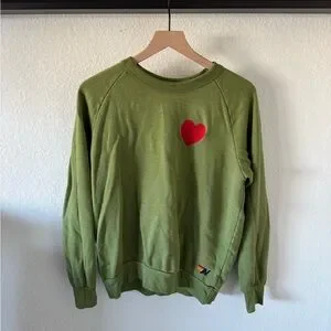 Olive green crewneck sweatshirt by Aviator Nation. Features a red heart applique on the chest. Small multicolor logo near the hem. Relaxed, casual silhouette.