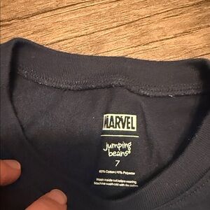 Two Marvel short-sleeve tees featuring bold superhero graphics. One navy tee with large stylized MARVEL block print in orange and yellow tones. One black tee with multicharacter comic-style art in bright orange, blue, red, yellow, and flesh tones. Fun, eye-catching designs for fans.
