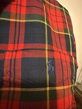 I re-worked this man’s Ralph Lauren plaid button-front shirt into a ladies shirt by shortening the hem and adding this cute ruffle collar!! Red, navy and yellow tartan pattern. Long sleeves. Can be tied or front tuck! Soft woven fabric with classic preppy vibe.