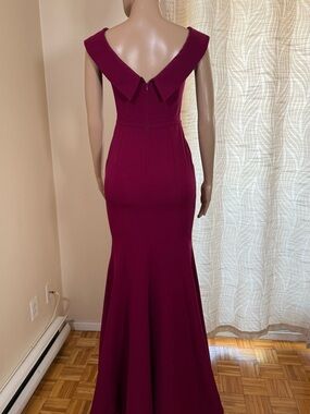 Plum off-shoulder maxi with a V-style neckline. Fitted through the waist and hips. Mermaid skirt flares for movement. Clean, tailored seaming for a polished look.