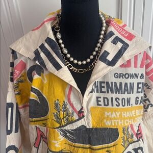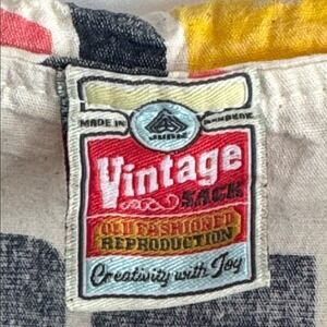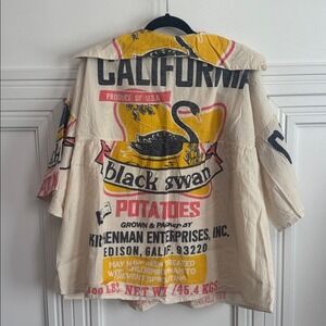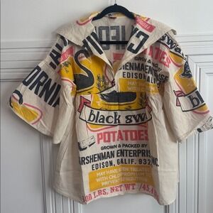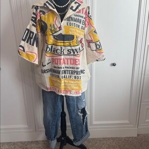 Unique top made from reproduction vintage flour sacks. 100% cottons. One size - flowy cut. Fits medium to XL. Features a hot air balloon print. Perfect for a statement look.