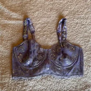Lavender lace underwire bra with metallic gold embroidery. Soft lined cups for gentle shaping. Embellished straps add sparkle. Scalloped lace band finishes the look. Smoke free home