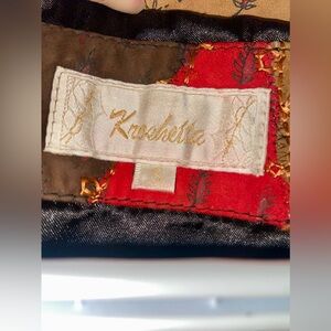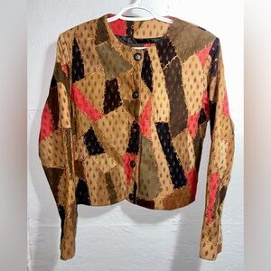 Kroshetta vintage patchwork genuine-leather suede jacket size small. Buttons up. Has some really cool and unique designs! A shorter torso style, almost cropped-like. Has shoulder pads. Really cool and unique looking jacket!