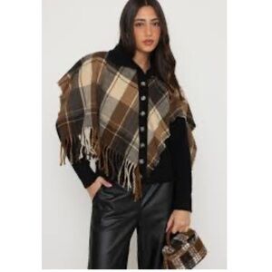 Elevate your layering game with this cozy elomelo button-front poncho. Featuring a timeless plaid pattern in shades of chocolate brown, cream, and black, this piece is the perfect blend of comfort and "old money" style.
