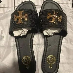 Elegant black slide sandals featuring a gold logo accent on the strap. Soft cushioned footbed for all-day comfort. Easy slip-on style for quick, chic looks. Pairs well with casual and dressier outfits.