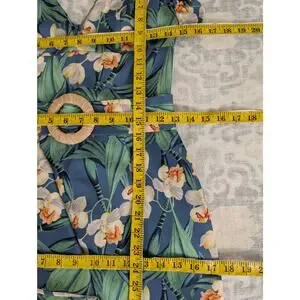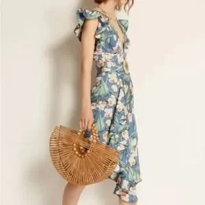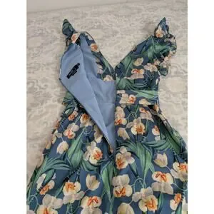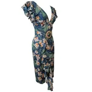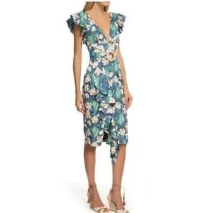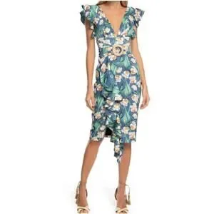 A tropical floral print defines this sweeping midi dress with a cascading ruffle at the skirt.