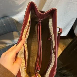Calvin Klein shoulder bag. Monogram coated canvas body. Red leather trim and handles. Gold-tone hardware and logo. Top snap closure and open interior. Classic everyday style.