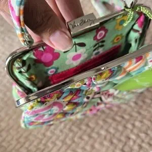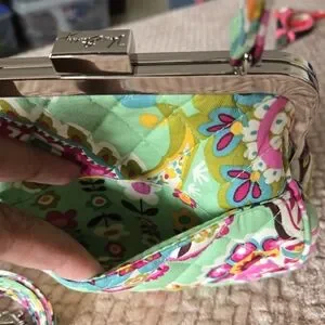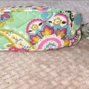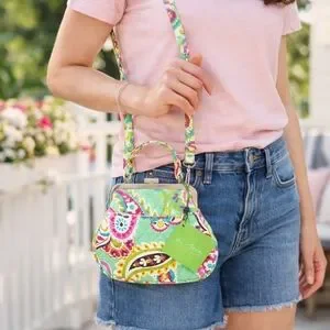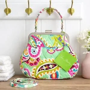 Vera Bradley quilted handbag in vibrant green paisley print. Features a top handle and detachable strap for versatile wear. Secure kiss-lock closure and polished metal frame. Colorful pattern adds a playful, stylish touch to any outfit.