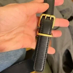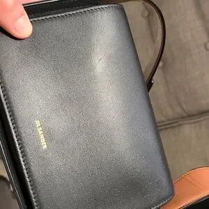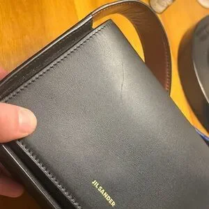 Stunning and versatile mini bag from modern designer Jil sander. Can be worn as shoulder or crossbody. Minimalist and elegant appeal, black calfskin leather and gold buckle hardware and gold foil logo. Brown leather accent on interior of the strap. Magnetic snap closure.