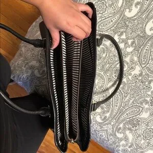 Sleek kate spade shoulder tote in black pebbled leather. Cream piping along sides for contrast. Dual top handles and gold-tone logo plaque. Clean, structured silhouette for daily use.