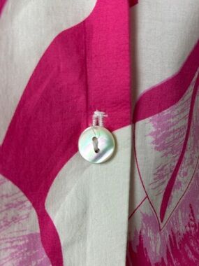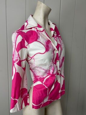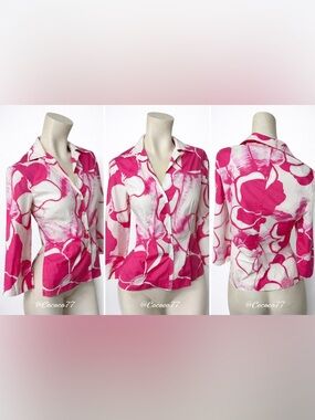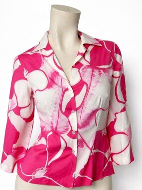 Beautiful Trina Turk Los Angeles floral blouse featuring a bold pink and white tropical print 🌺 — perfect for resort wear, vacation, or polished everyday style.