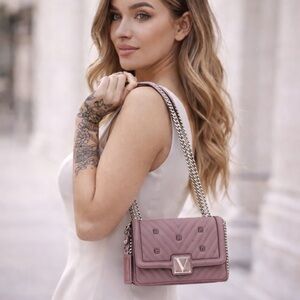 Elegant lavender quilted crossbody with silver-tone chain strap. Flap closure with signature V logo hardware. Compact structured silhouette for day-to-night wear. Soft textured finish and subtle stud accents.