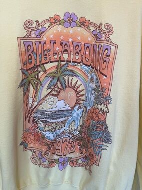 Soft yellow Billabong crew with vibrant retro surf graphic. Tropical scene features palm trees, sun, waves, and floral accents. Casual pullover with vintage-inspired artwork.