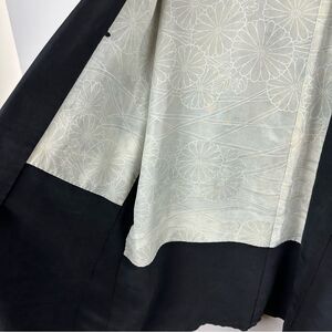 Elegant vintage Japanese kimono in deep black silk with stunning floral embroidery on the back. The interior features a beautiful white chrysanthemum pattern, adding an extra touch of traditional detail. Flowing sleeves and a relaxed open-front silhouette make it perfect as a statement piece, robe, or lightweight jacket.