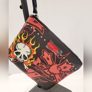 Glossy black tumbler featuring Ed Hardy logo. Front red heart graphic with banner and decorative accents. Comfortable handle and secure lid. Eye-catching rocker tattoo style print. Ed Hardy wrislet with rhinestone skull.