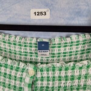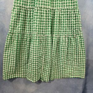 Old Navy green and white gingham midi dress features a classic tiered silhouette with a smocked bodice and flutter sleeves. The square neckline is accented by a functional button-front detail, while the seersucker-style textured fabric provides a breezy, lightweight feel. Perfect for cottagecore or picnic-ready summer styling, this dress offers a comfortable, flowy fit through the skirt.