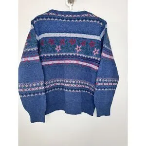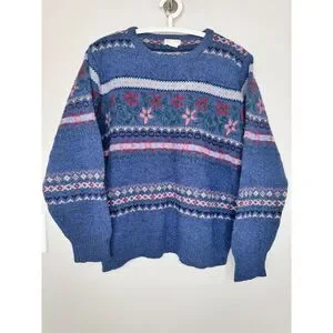 Classic vintage Brooks Brothers wool sweater featuring a timeless Fair Isle knit pattern in rich blue tones with red, green, cream, and soft pink accents. This cozy heritage piece has a traditional crew neckline, ribbed cuffs, and hem, offering a relaxed, timeless silhouette. Made from 100% wool, it has the substantial feel and warmth expected from quality vintage knitwear. Minor wear at the hem is present and adds to its authentic vintage character. A perfect layering piece for fall and winter, ideal for preppy, heritage, or cottage-inspired wardrobes.