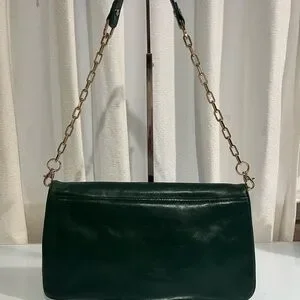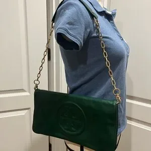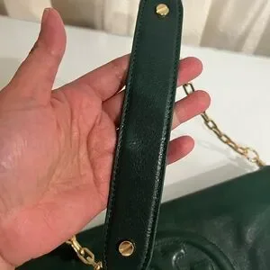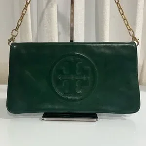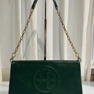 TORY BURCH DARK GREEN CLUTCH WITH GOLD CHAIN