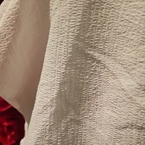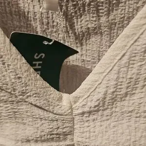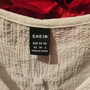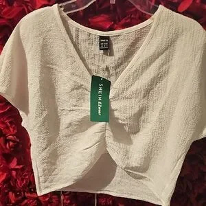 This cream blouse from SHEIN features a chic ruched design and a trendy cropped length, perfect for a casual yet stylish look. The short sleeves and light fabric make it an ideal choice for warm weather. Its textured surface adds a touch of elegance to any outfit.