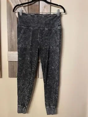 Stretchy high-waist jogger leggings in an acid wash black. Ribbed wide waistband and cuffed ankles. Subtle front seam and side pocket detailing. Sleek everyday athleisure piece.