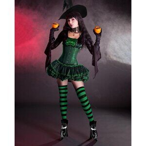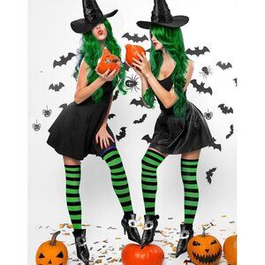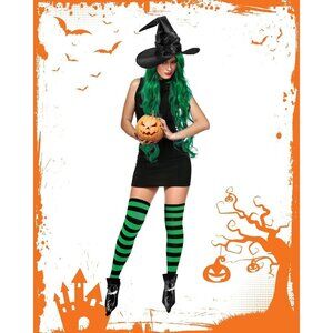 Features: This complete witch costume set has everything you need—black witch hat, striped thigh-high socks, and boot covers. Made with soft, comfortable materials like PU leather, matte satin, and a polyester-cotton blend. Easy to mix and match with your favorite dress or costume for a full witchy look.