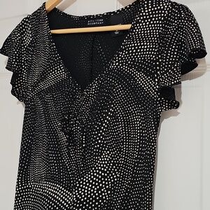 A classic with a little twist ⚫🤍 This New York & Company dress blends timeless black-and-white polka dots with a modern silhouette. The subtle swirl dot pattern adds movement, while the front tie detail brings a soft, feminine touch.