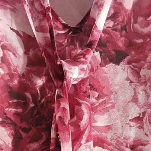 Chic lightweight sleeveless pullover tie neck blouse with vibrant floral design. The blouse is sheer with a vneck and has a pink lining. Perfect for adding elegance to any outfit.