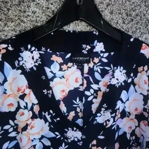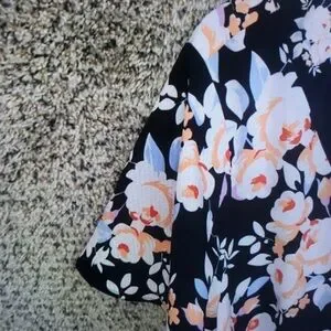 Lightweight V-neck top with a navy base and pink and white floral print. Soft, breathable fabric for all-day comfort. Short sleeves and a flattering cut for versatile styling. Easy to pair with jeans or skirts for a polished casual look.