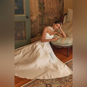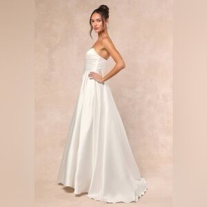 Stunning Lulus Khalida white satin strapless gown, new without tags and never worn. Crafted from luminous woven satin, this timeless bridal dress features a romantic sweetheart neckline and a structured strapless bodice with elegant pleating and supportive boning. Hidden no-slip strips keep everything in place, while a high fitted waist flows into a voluminous, ball gown-inspired skirt with a sweeping maxi hem and subtle train. Hidden back zipper closure. Fully lined.