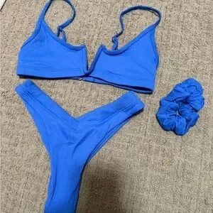Bright blue ribbed bikini set with a supportive V-front top and flattering V-cut bottoms. Adjustable straps and soft stretch fabric provide comfortable, secure wear. Includes a matching bright blue scrunchie for a coordinated beach-ready look.