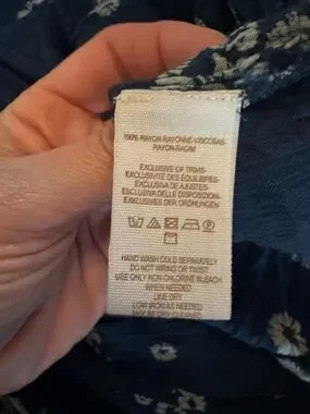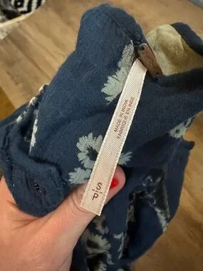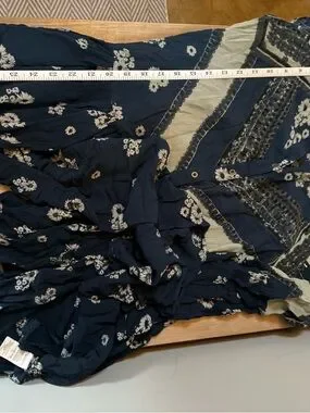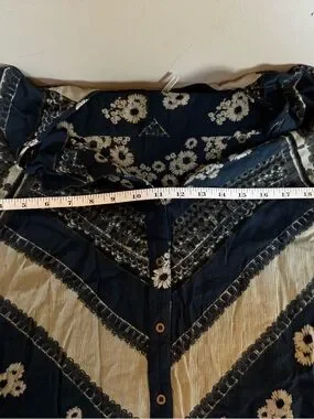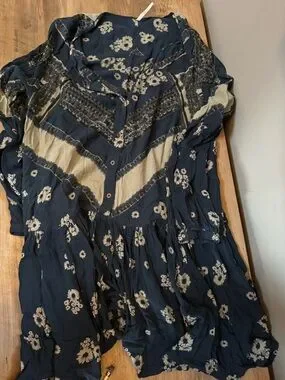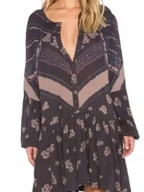 Relaxed bohemian mini dress in a flowy tiered silhouette. Black base with delicate cream floral print. Buttoned yoke and subtle chevron pattern detail. Long bell sleeves for added movement. Easy, breezy style perfect for casual outings.
