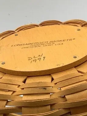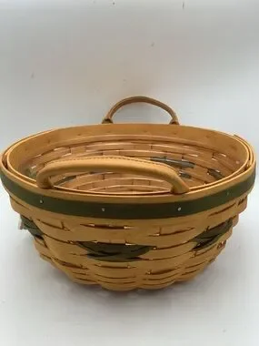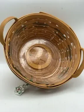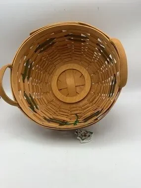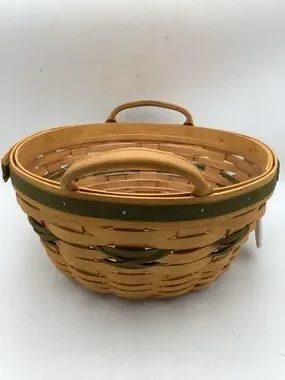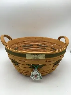 Vintage Longaberger 1999 Christmas Collection popcorn round basket with leather handles, a green basket weave design, “From our house to yours” charm and plastic insert.