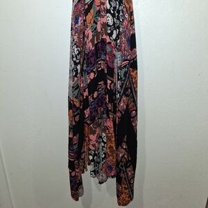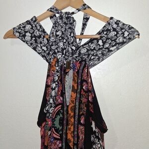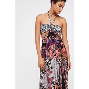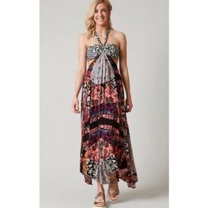 Beautiful bohemian self tie halter maxi with mixed patchwork prints. Open back with hook & tie closure. Flowy handkerchief bottom for an easy movement. Vibrant, eclectic color mix for versatile looks. Cutout on sides. Bandeau top.