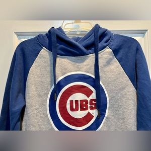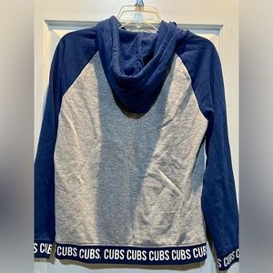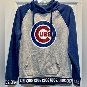 Official 47 brand hoodie with Chicago Cubs logo. Grey body with blue sleeves and hood. Red and blue logo detail on front. Kangaroo pocket and drawstring hood. Team name trim at hem and cuffs.