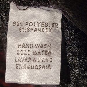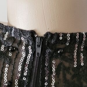 Hook-and-eye front closure, snap bottom and full back zipper closure.