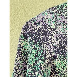 Condition: Pre-owned IBKUL performance shirt in clean, gently worn condition with multicolor abstract print. Fabric, seams, and mesh panels are intact and stretchy, free of stains, holes, or pilling. One small loose thread at the neckline binding as shown; interior printed brand, size, and care information are clear and readable.