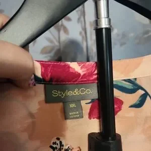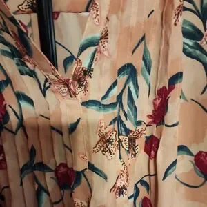 Soft peach blouse with a floral pattern. Split V-neck and gentle pleating at the front. Long sleeves and a relaxed silhouette. Feminine red blossom and green leaf accents.