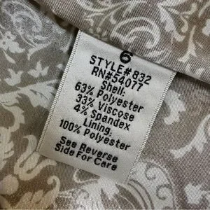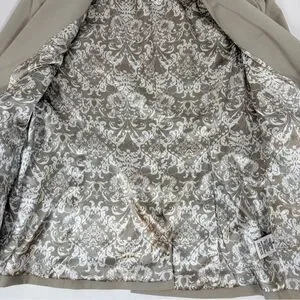 Cabi “Dynamo” two piece suit set features a chic greige color with stylish contrast white topstitching along the lapels and pockets. The blazer is a single button closure with a beautiful damask print lining. The matching trousers are a classic straight leg fit with a clean waistband. Perfect for the office or formal events. Professional chic and timeless.