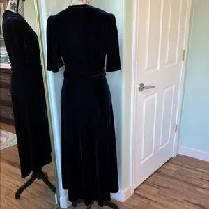 Luxurious Dark Blue velvet dress with matching belt. . Features a wrap design and elegant belt. Perfect for special occasions.