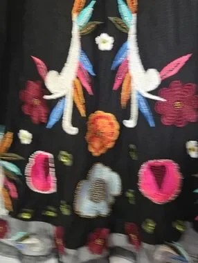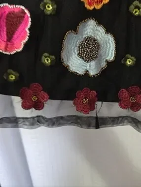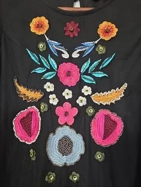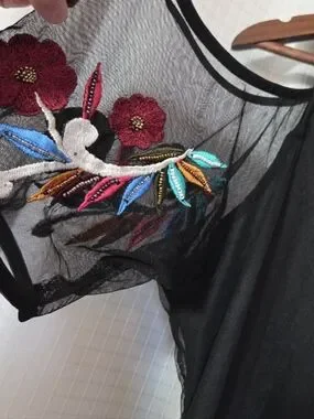 This tunic features beautiful embroidered floral designs on tulle fabric, adding a touch of nature and bohemian charm. The beaded accents and sheer details make this tunic stand out, while the half sleeves and round neckline provide comfort and elegance.